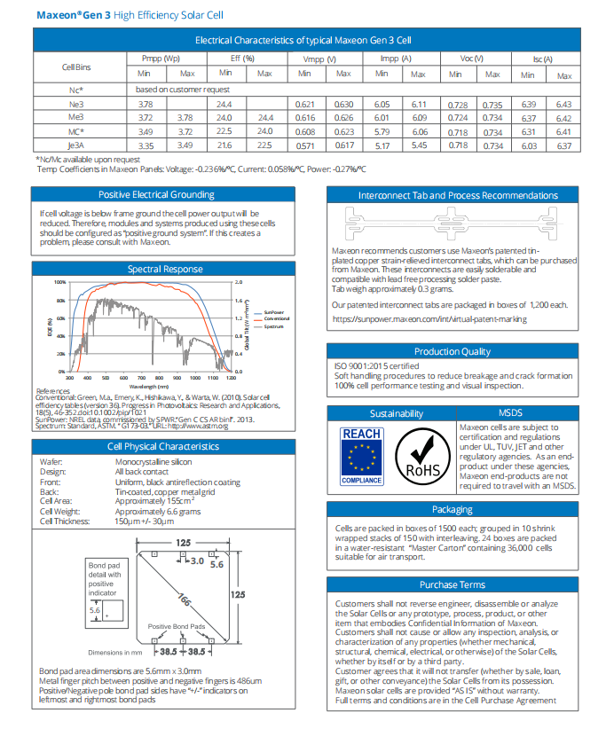 3.78W-3.89W Bin Me3/Ne3 Sunpower solar cells with long-term supply